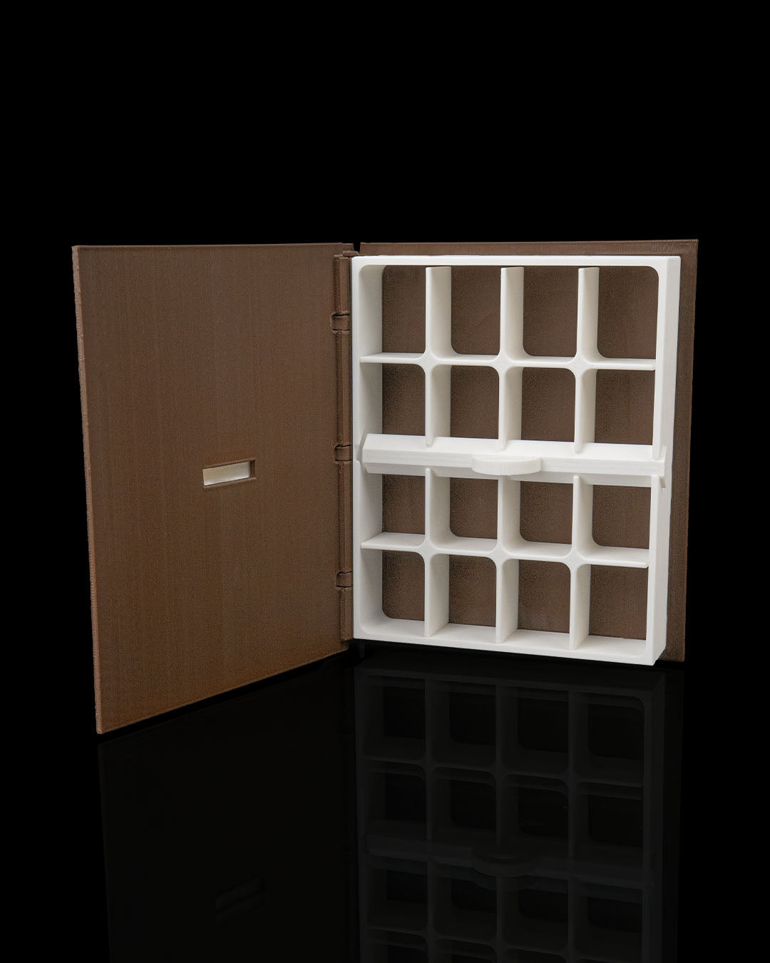 Function: Holds 16 dice securely; clasps shut with the sword design