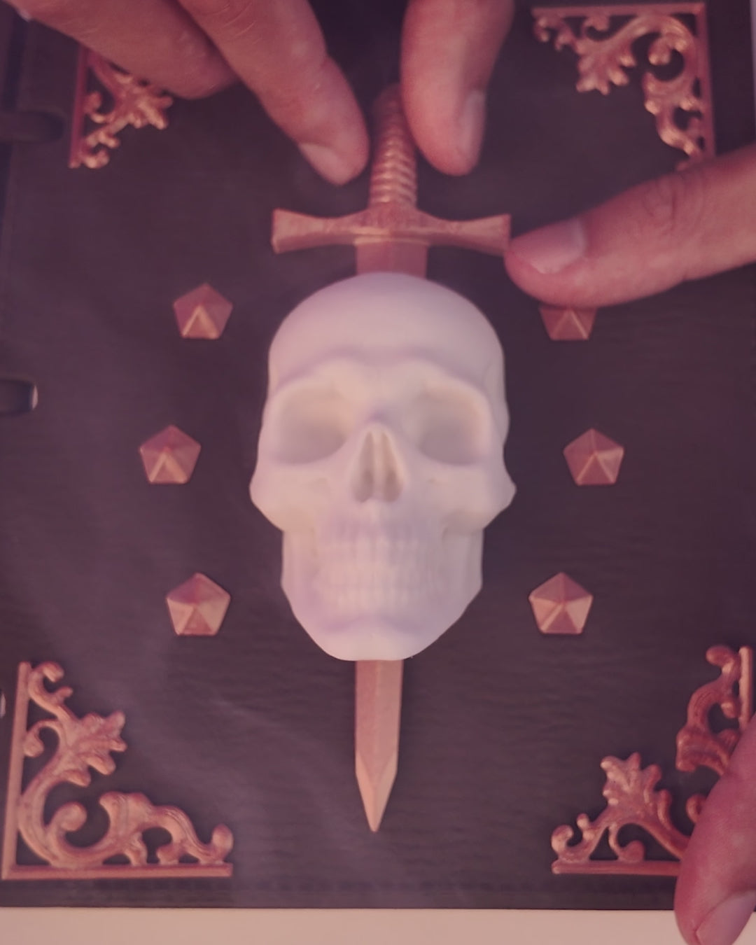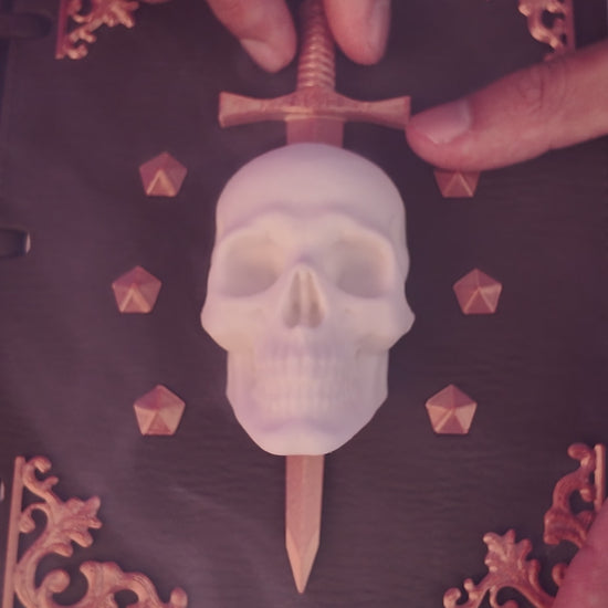 Unleash your inner Dungeon Master with this one-of-a-kind tome! Styled like an ancient book bound with a sword clasp and skull detail, this dice holder keeps your treasures safe and ready for play. Inside, it holds up to 16 dice sets, secured neatly for your next campaign.